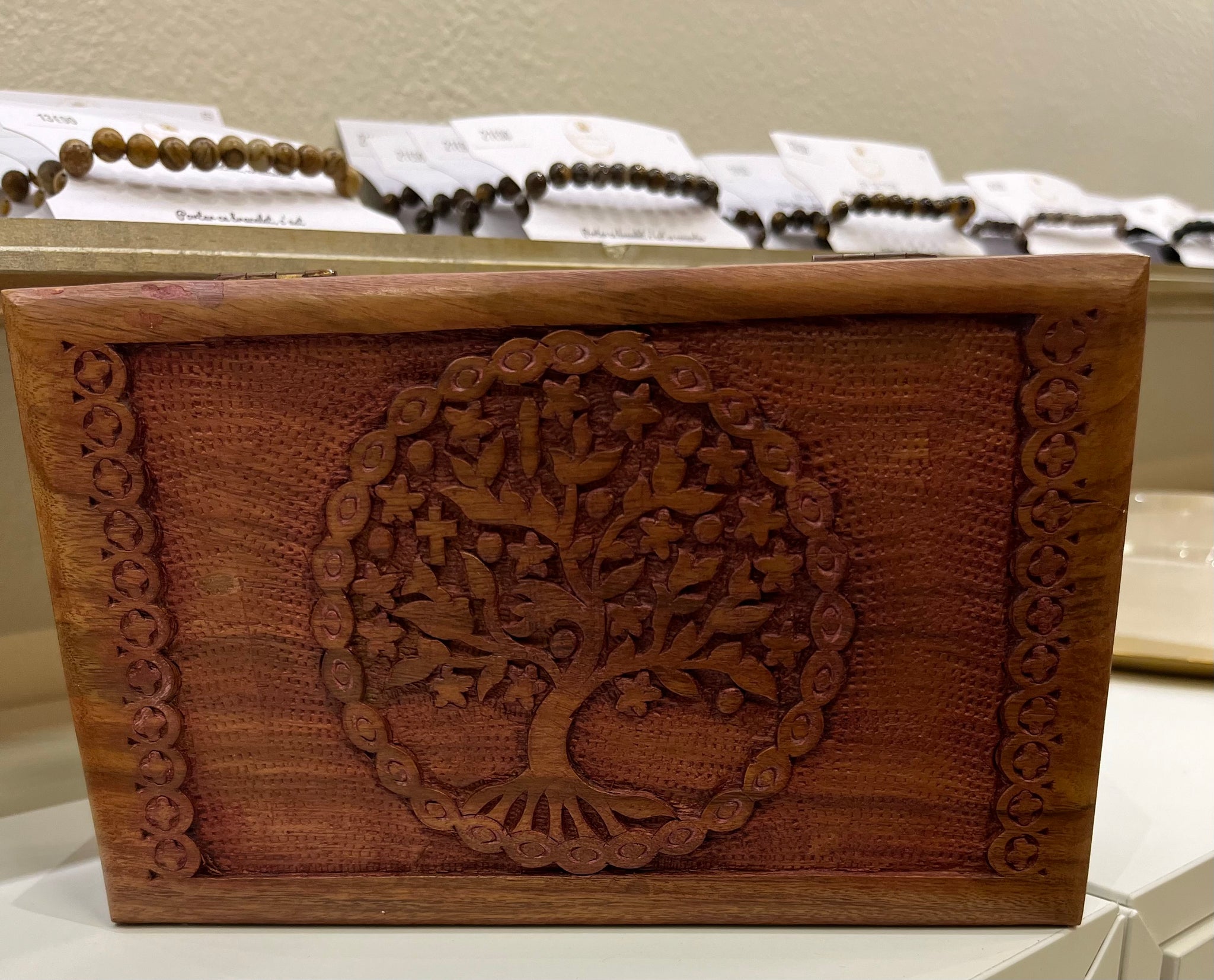 Ajoutez une touche de magie avec notre boîte à bijoux en bois décorée d’un arbre de vie !